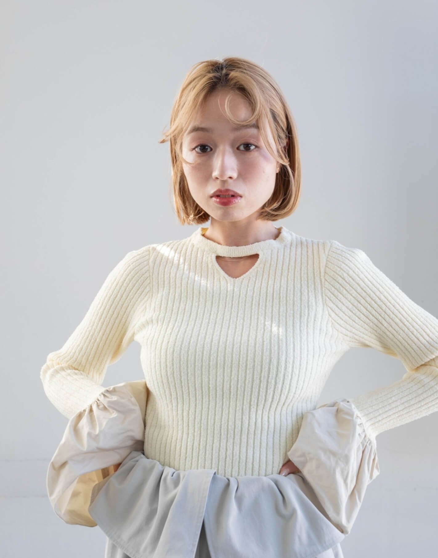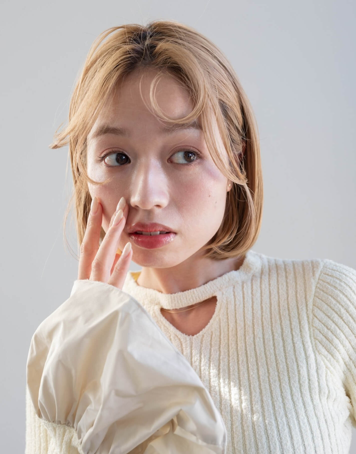 • シンプルなボブにポイントでカールをつけ、柔らかい雰囲気に。ほわっと柔らかい艶ピンクメイクを組み合わせました。