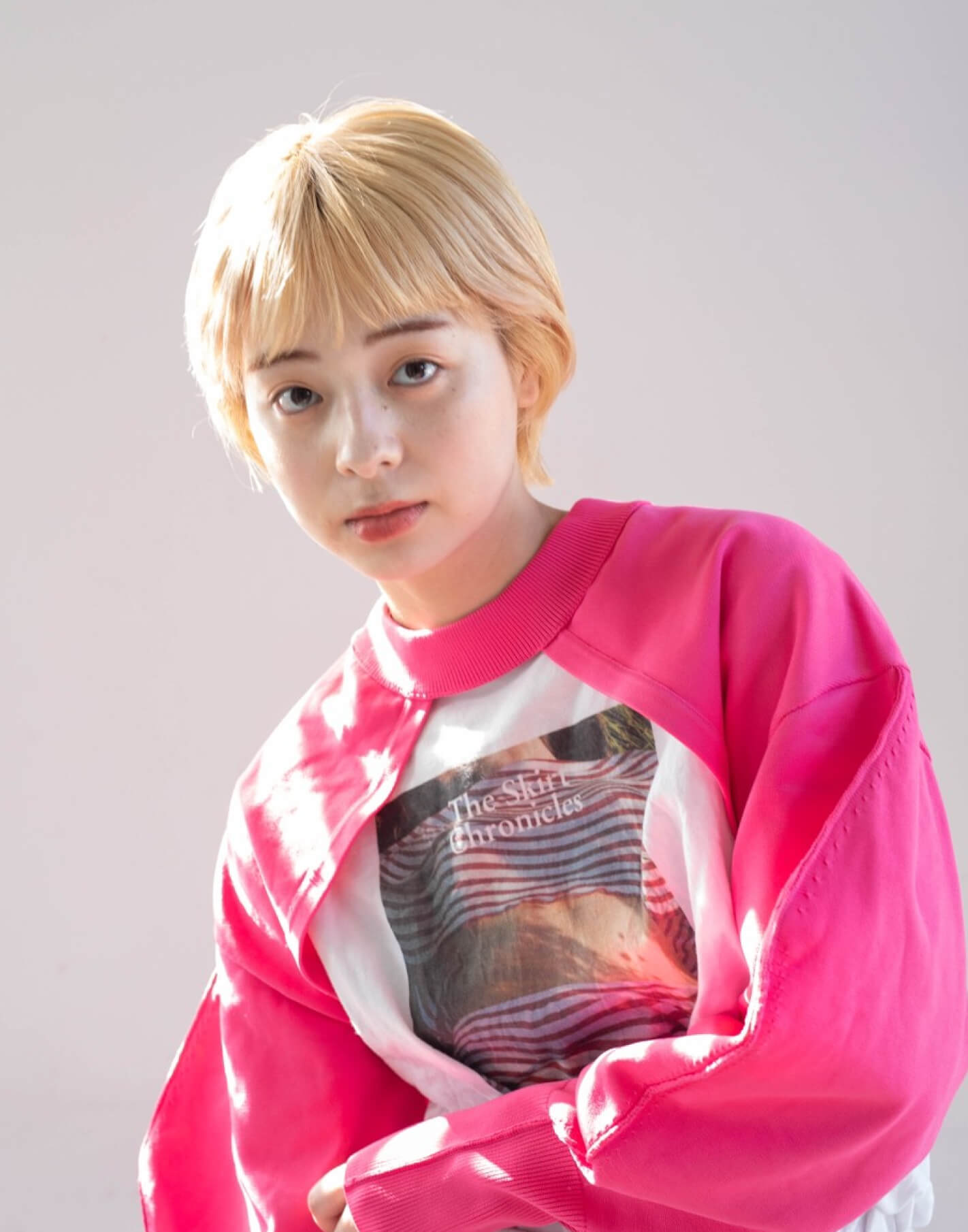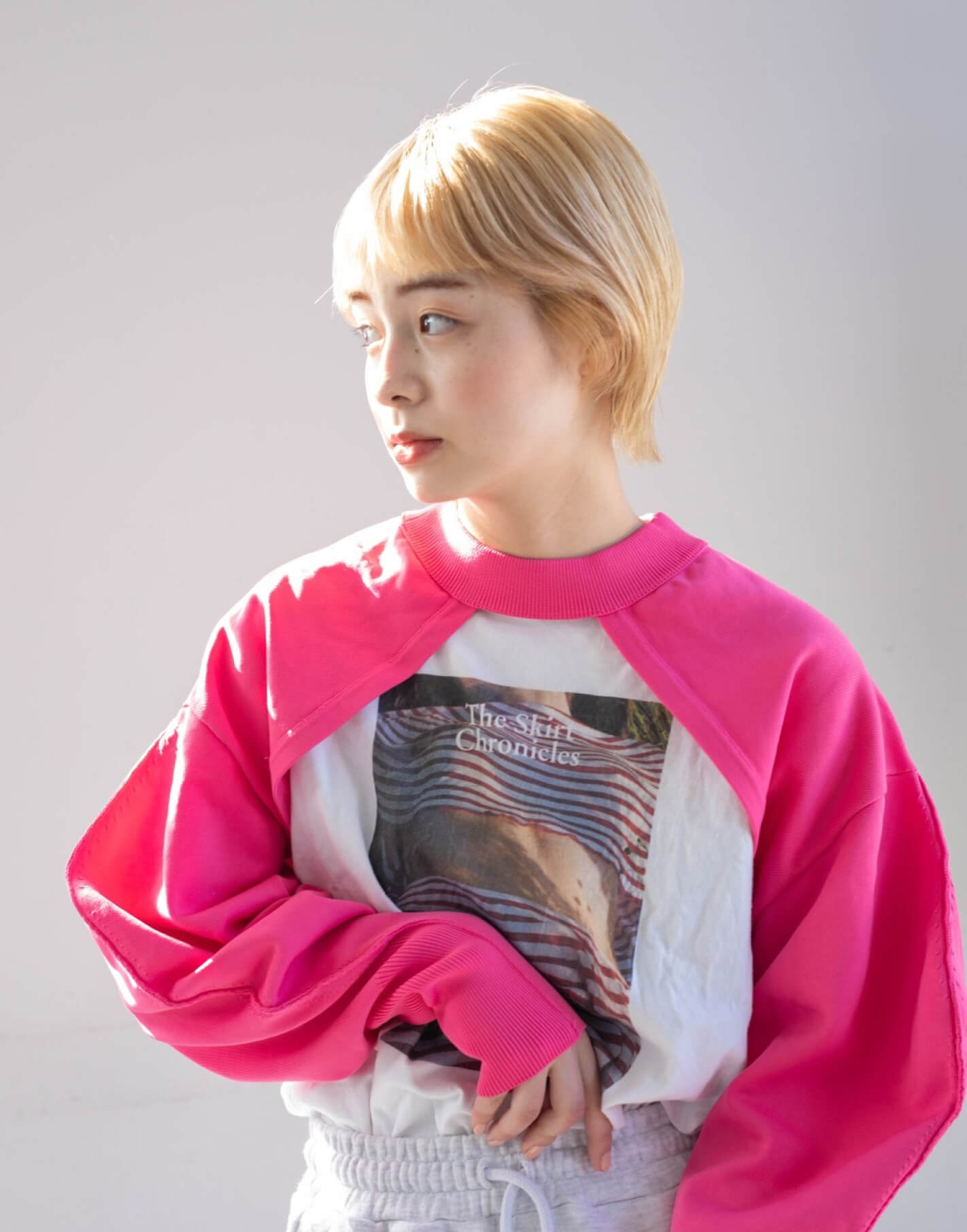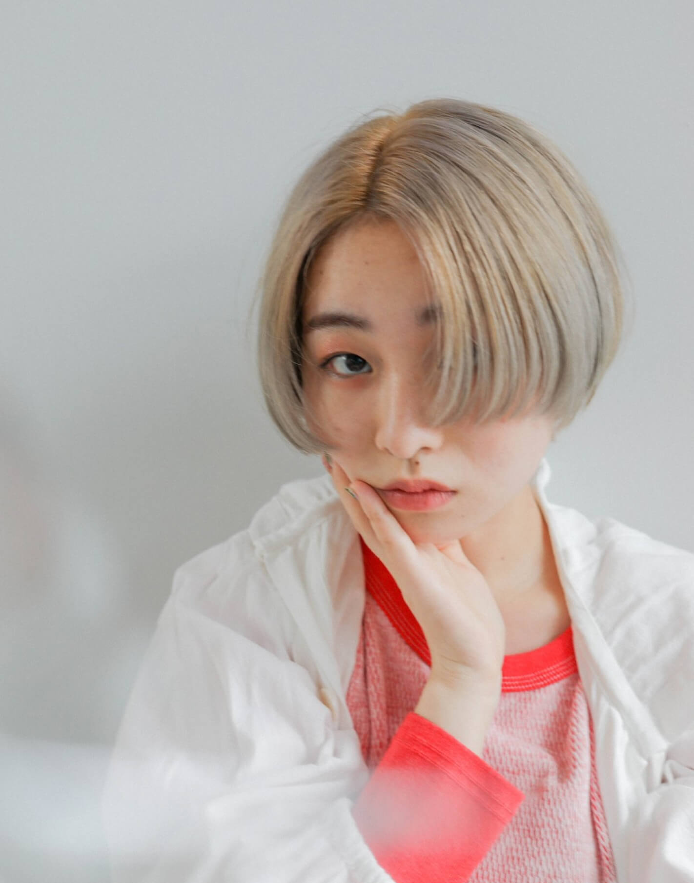 • ハイトーンショートにシンプルなスタイリングでナチュラルな雰囲気に。トップスのピンクとメイクで統一感を出して。