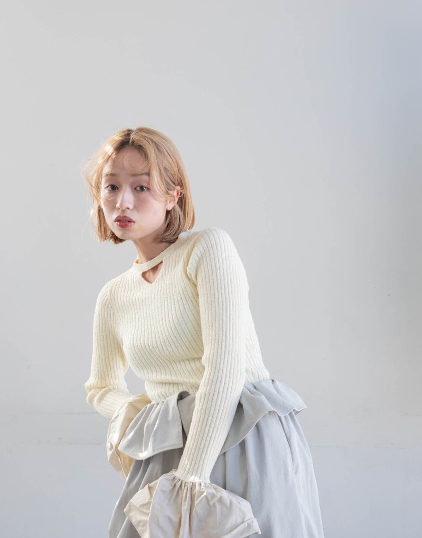 • ハイトーンカラーが映えるモデルさんに似合わせたタイトなスタイリング。抜けのあるモードでこなれた雰囲気に。