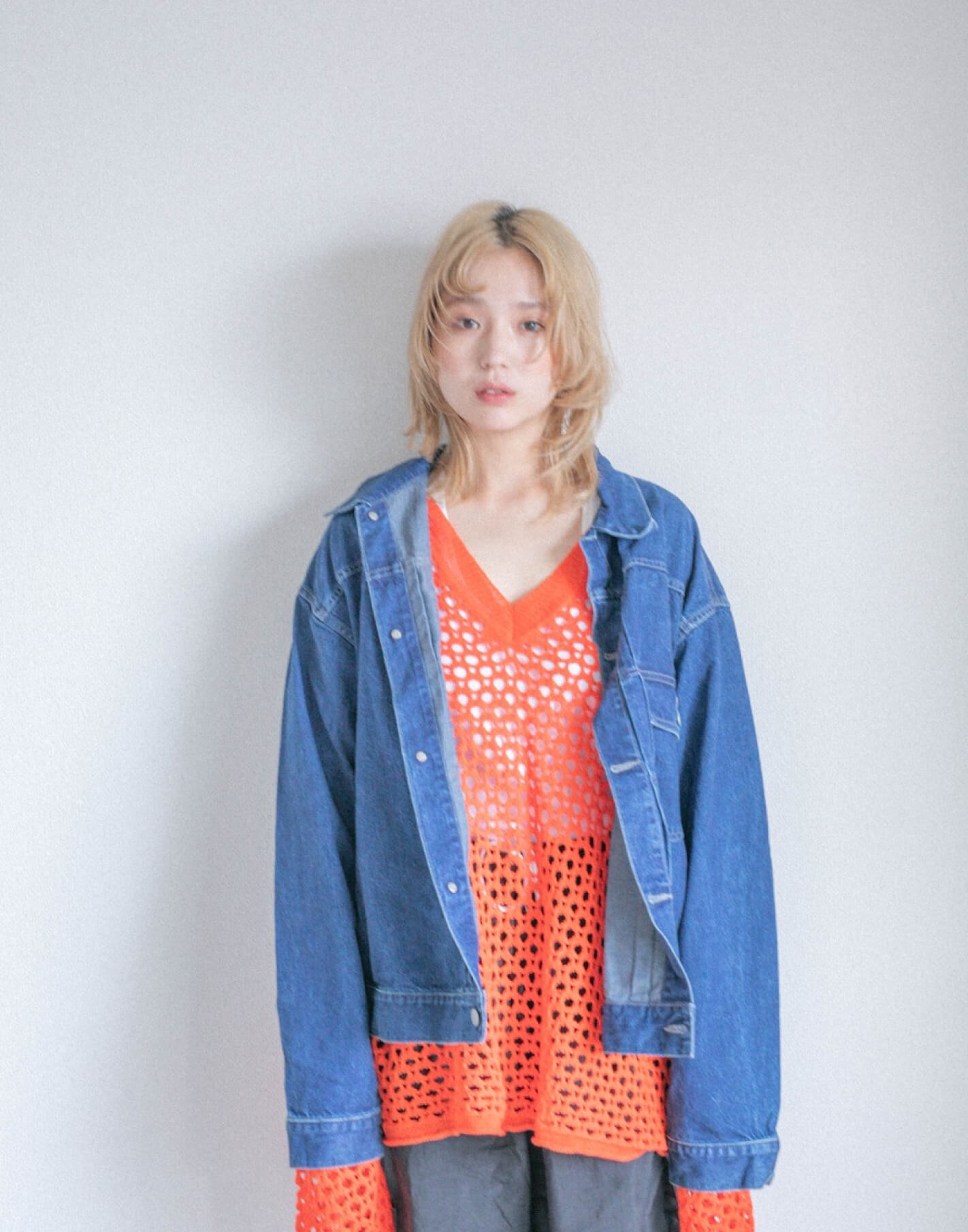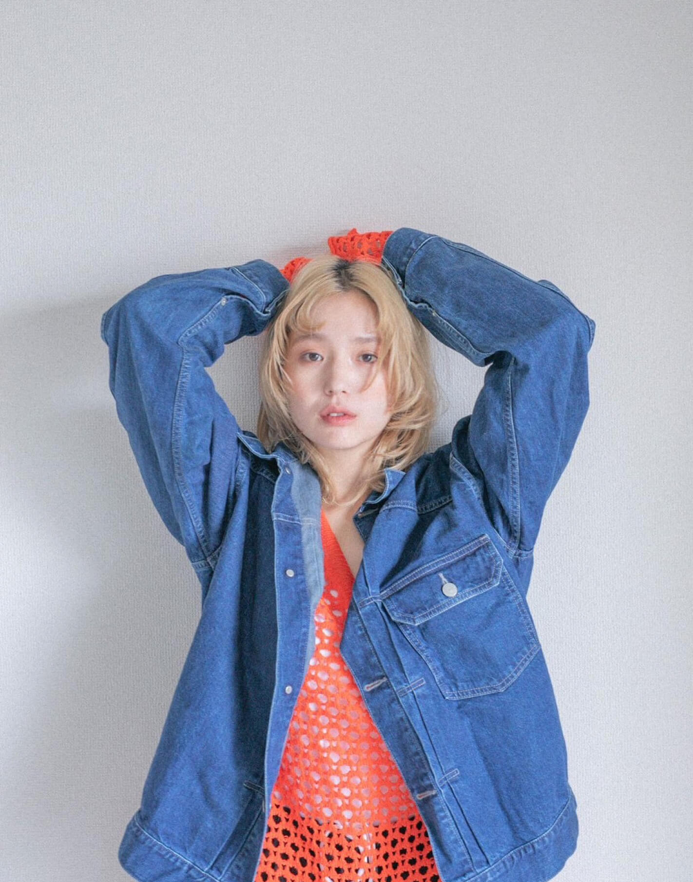 • 抜きっぱなしのブロンドにデニムとオレンジの組み合わせが可愛い。毛先と顔周りの動きでルーズな質感に。