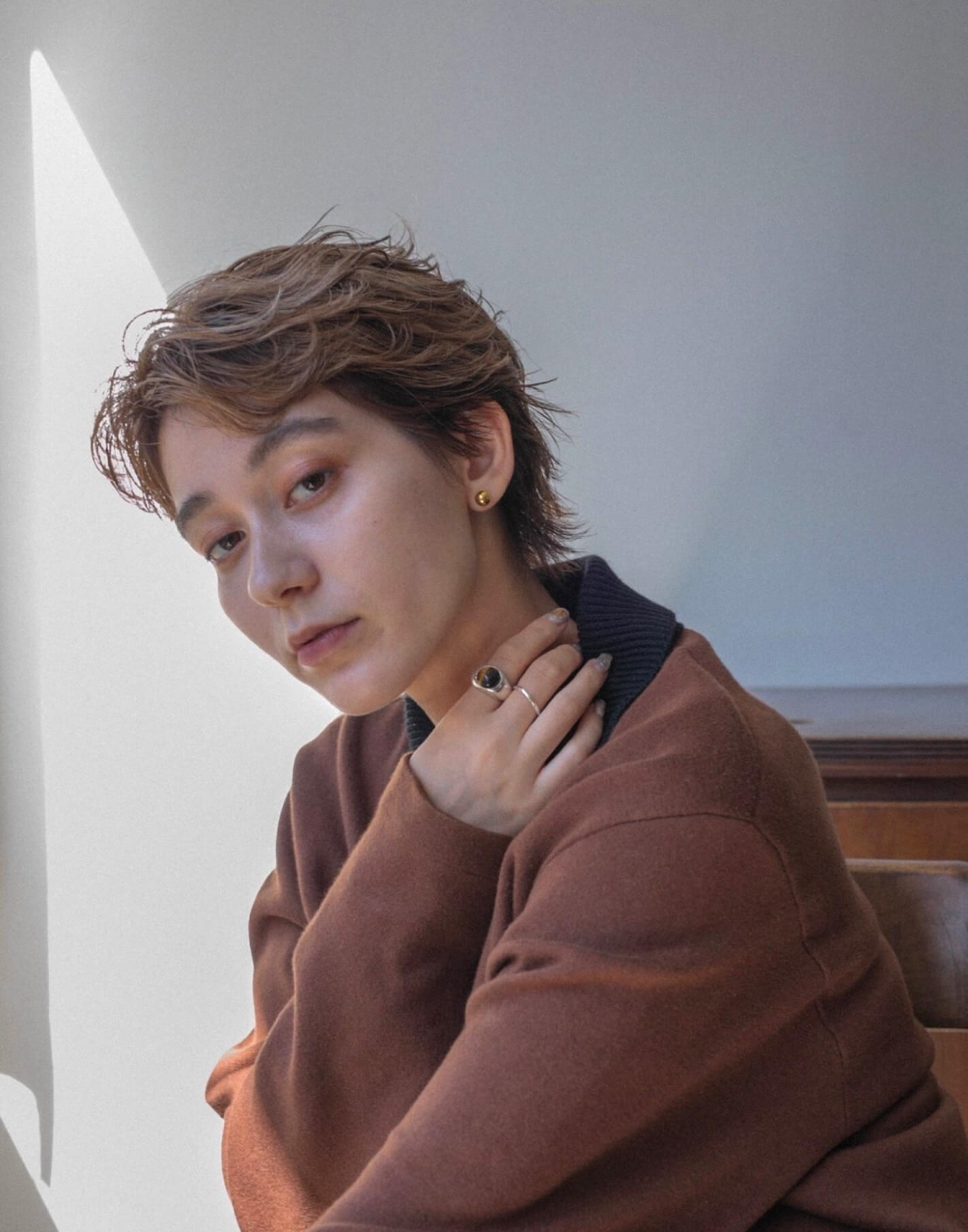 • 雰囲気に合わせたハンサムショートと、透明感のあるオレンジブラウンカラー。シンプルながら大人っぽさと柔らかさのあるヘアに。