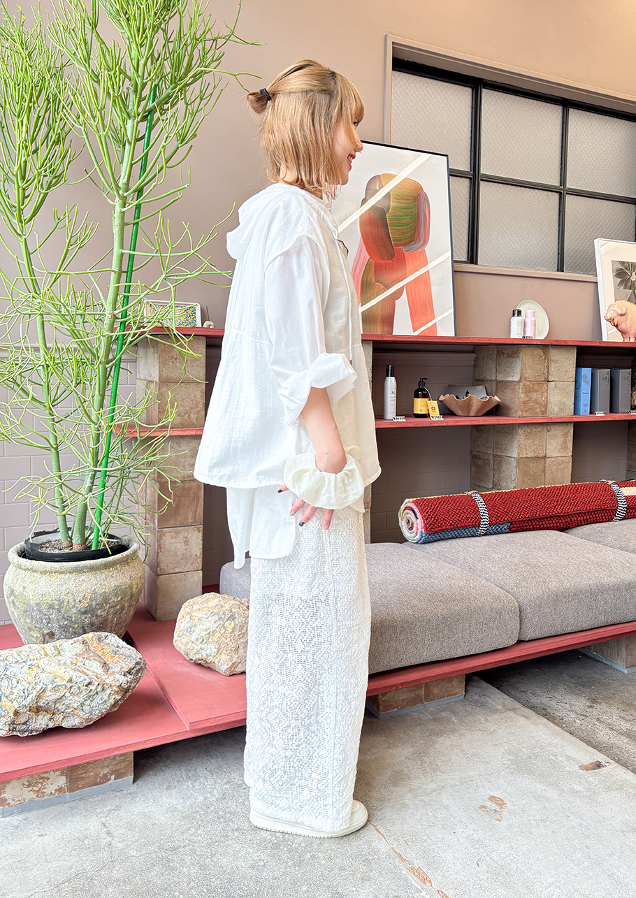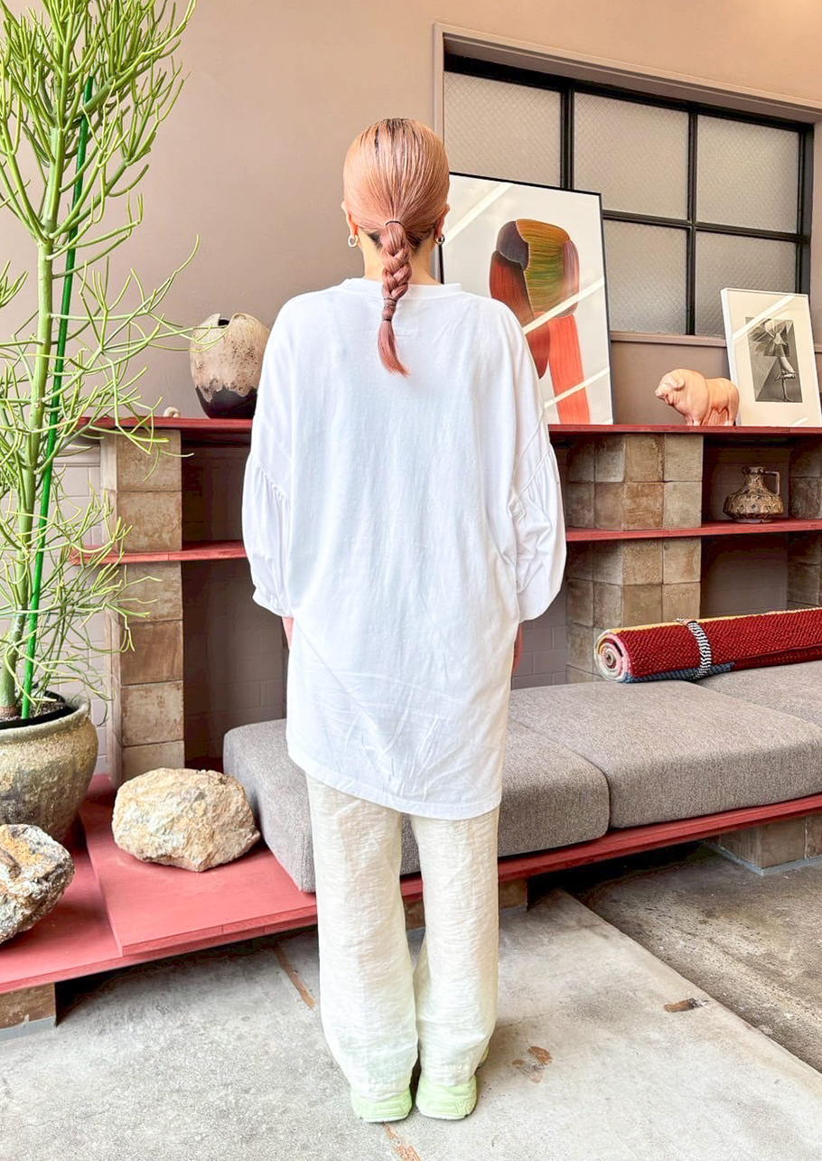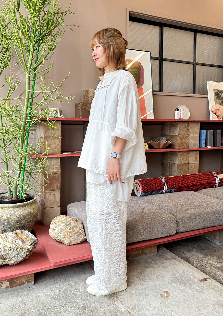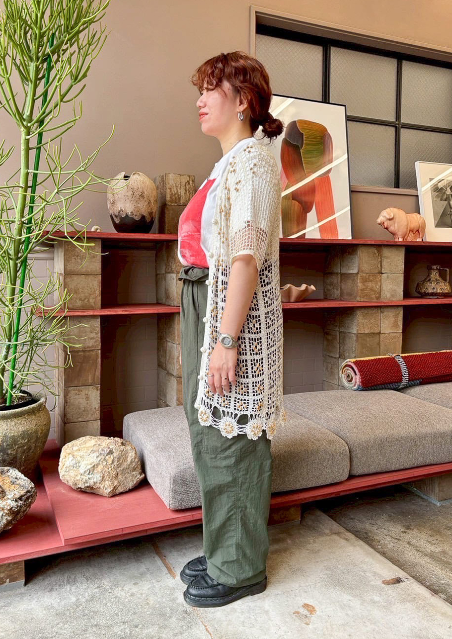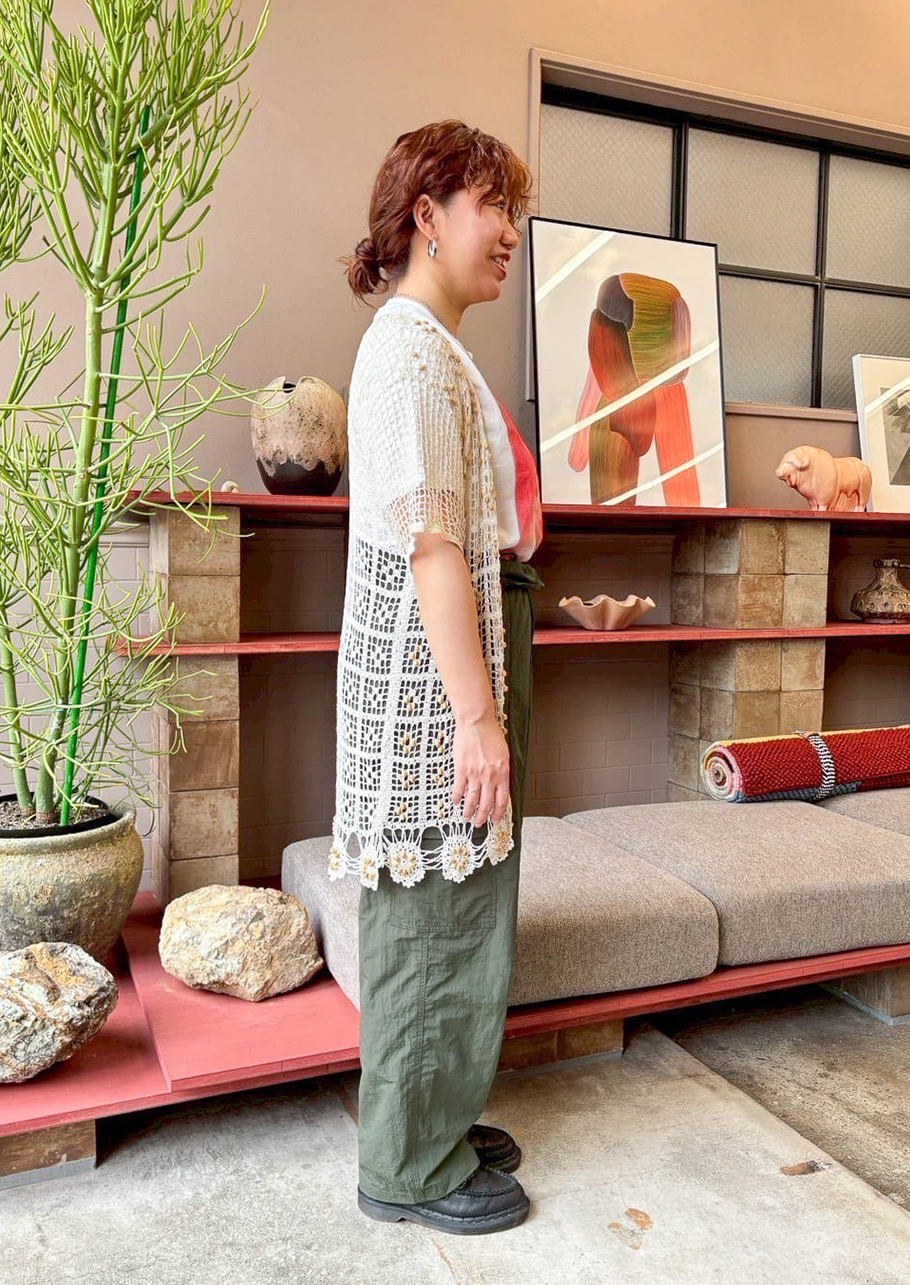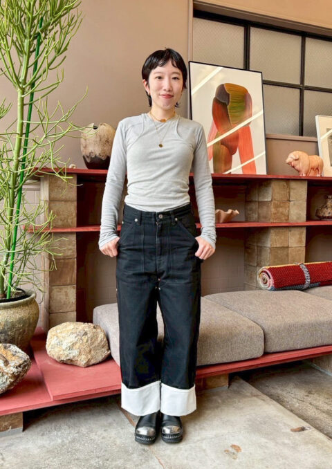 シンプルなものを重ねるのが好き。でも、ただ、シンプルなだけではなくて、どこかに個性を持ったもの、つくった人の思いが感じられるものがいいですね。自分が身につける服は、いつも感覚的に選んでいます。服の力だけに頼るのではなくて、人が袖を通して、滲み出てくるものが大切だと思います。